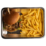 Grilled halloumi with a plant-based patty, vegan mayo, dill pickle, lettuce & tomato